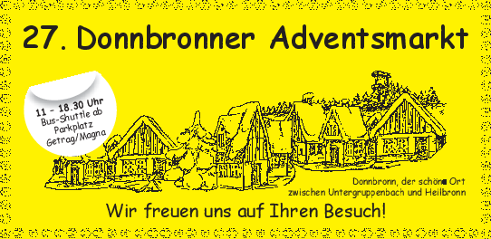 Was im Sommer 1997 bei brütender Hitze mit einer „Schnapsidee“ begann, entwickelte sich im Laufe der Jahre zu einem absoluten Dauerbrenner in der ganzen Region. Der Donnbronner Adventsmarkt besticht durch seine „dörfliche“ Note. Im alten Ortskern stellen die Bürger ihre Schuppen, Garagen, Scheunen, Vorgärten und Höfe für die Marktbeschicker zur Verfügung. Feilgeboten wird Regionales und Selbstgemachtes, keine Importware aus Fernost. Schon viele Monate vor dem ersten Adventssonntag wird in und um Donnbronn gebastelt, geschreinert, geklebt, gestrickt, gehäkelt, gekocht. Da verwandeln sich Holz, Stoff, Stroh und Papier in Zierrat. Mit allerlei Leckereien und Köstlichkeiten wie Marmeladen, Honig, weihnachtlichen Backwaren sowie dem landwirtschaftlichen Frischsortiment vom Feld lassen sich die Vorratskammern der Kundschaft füllen.