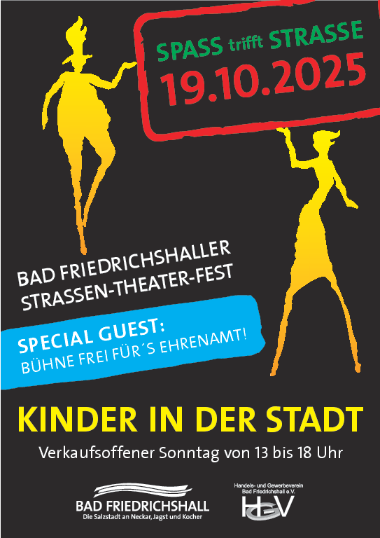 Unter dem Motto „Spaß trifft Straße“ bieten die Stadt Bad Friedrichshall und der Handels- und Gewerbeverein den Besuchern ein kurzweiliges Einkaufserlebnis. Einkaufswillige freuen sich gleichzeitig auf den verkaufsoffenen Sonntag.