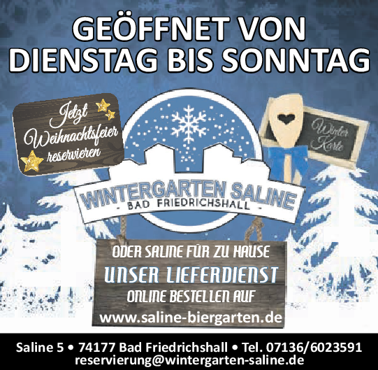 Am Samstag, 29. November, findet um 17 Uhr eine Geisterführung im Greckenschloss statt. Nach der Geisterführung zieht die Gruppe weiter zum Weihnachtsmarkt. Treffpunkt ist an der Bühne auf dem Weihnachtsmarkt, Kosten betragen acht Euro pro Kind, zahlbar direkt bei der Kinderstadtführerin. Anmeldung unter tickets@friedrichshall.de. Musikalisch wird beim Bad Friedrichshaller Weihnachtsmarkt wieder einiges geboten: Eröffnet wird der Weihnachtsmarkt am Freitag um 19 Uhr, musikalisch umrahmt von „Heilix Blechle“ in der Besetzung Trompeter, Horn, Posaune und Tuba. „Christmas rockt“ danach ab 19.30 Uhr mit Marc & Lobo & Friends.