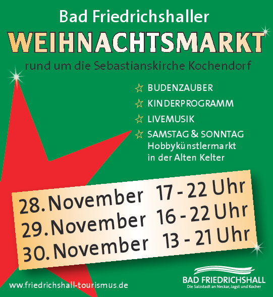 Klein und fein, gemütlich und familiär – so präsentiert sich der Bad Friedrichshaller Weihnachtsmarkt am ersten Adventwochenende. Ausschließlich ortsansässige Vereine und Gastronomen sorgen von Freitag bis Sonntag, 28. bis 30. November, dafür, dass es den Besuchern an nichts mangelt.